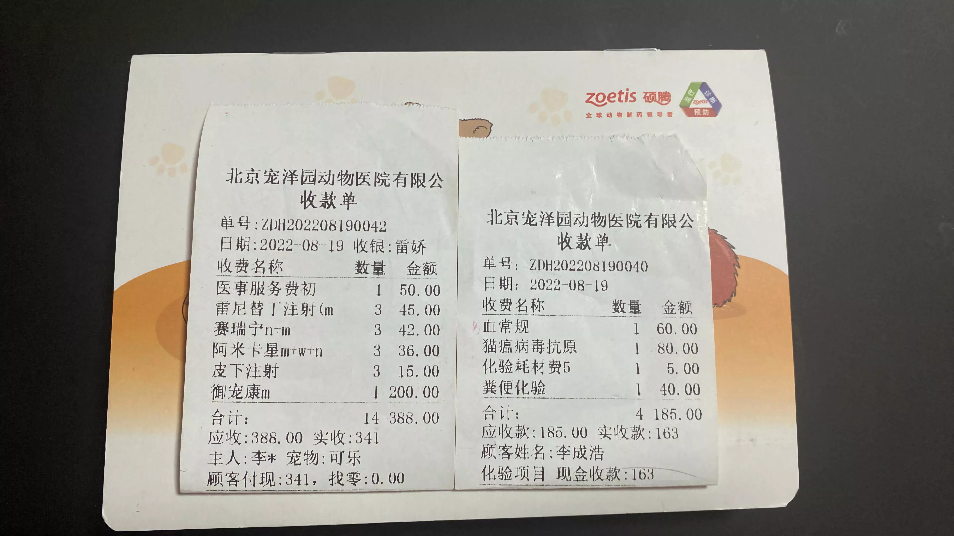 然后上周五就带它去医院做了检查,先做了个基础的检查,医生初步断定为肠道的问题,也就是我们人类的吃坏东西了。然后决定打三针看看后续效果如何。