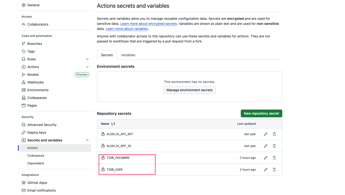 因为数据库的连接信息属于敏感信息,所以建议放到仓库的 Actions secrets and variables