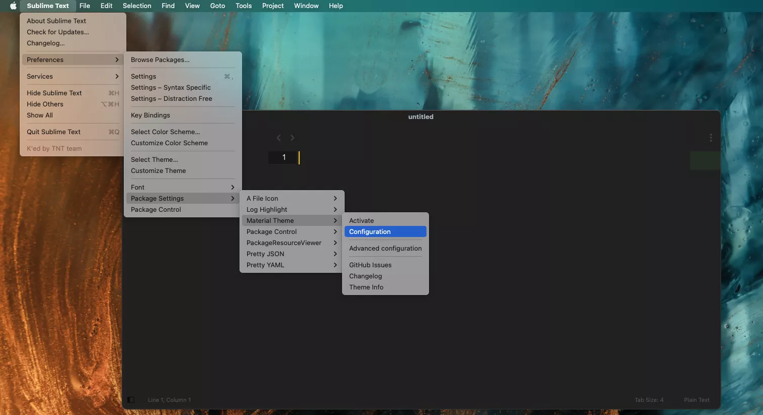 Package Control: Install Package回车,进入Package 搜索页面,搜索Material Theme安装即可。