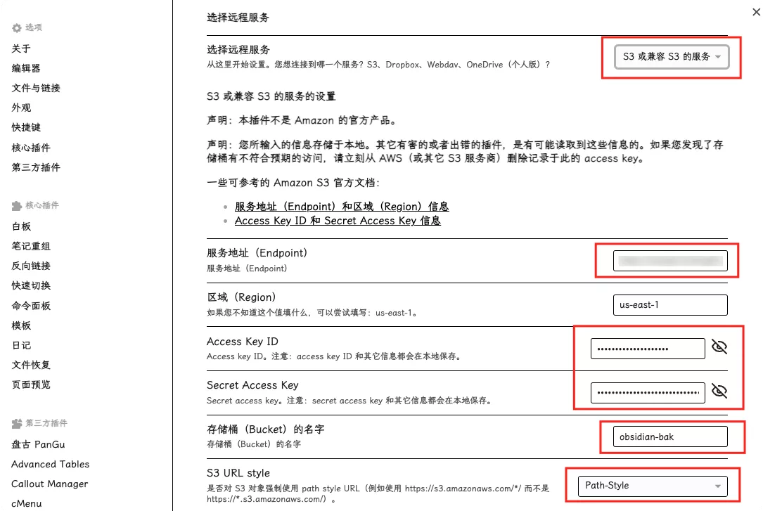 回到 Obsidian 中安装插件,remotely-save,安装完毕后,修改配置: