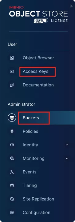 然后访问:http://ip:9001 访问控制台。 接下来需要新建存储桶和访问秘钥对。在如下导航中分别新建桶和 Access Keys 即可。