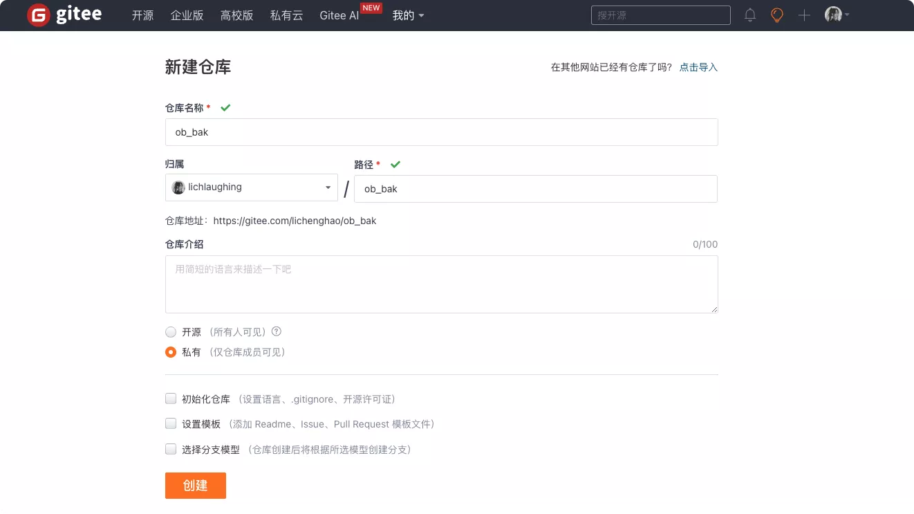 回到 Gitee 新建一个项目,用来备份我们的笔记文件。