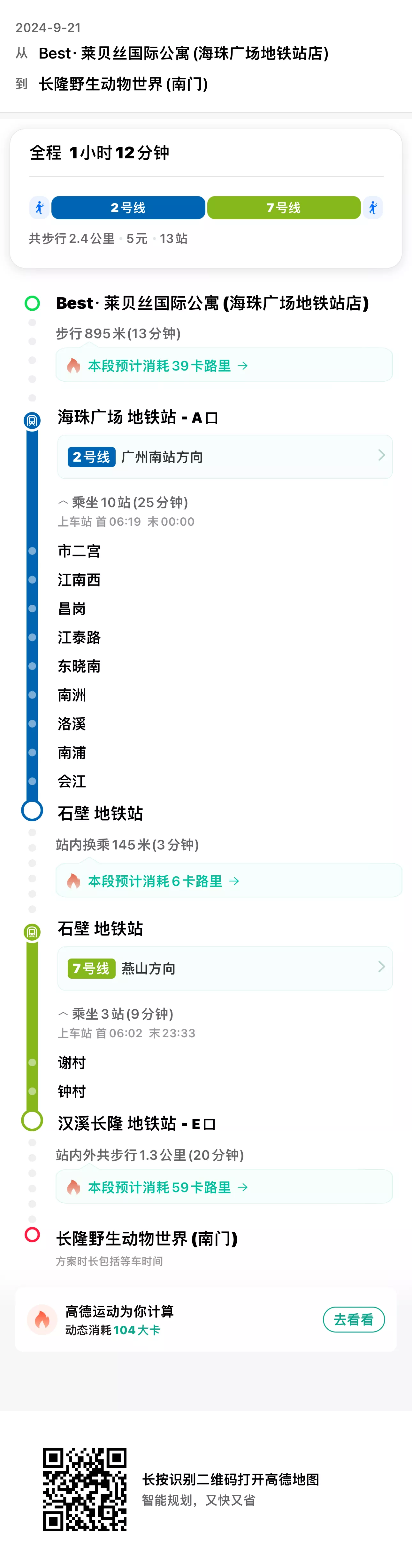 地铁 🚇:其中有个换乘比较少的,2 号线换 7 号线,然后步行到南门。