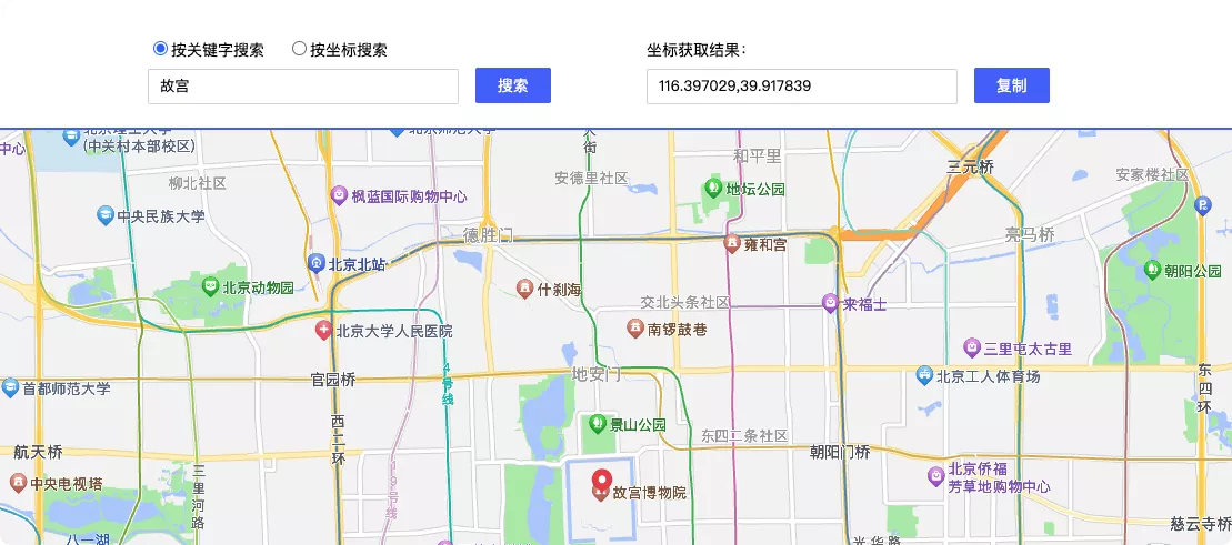 然后给自己定个位置,比如我在北京天安门附近。你可以去坐标拾取器 | 高德地图 API 获取位置的经纬度。