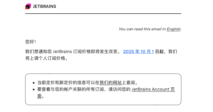 收到邮件通知,JetBrains 订阅价格即将发生改变。准确的说就是要涨价了。