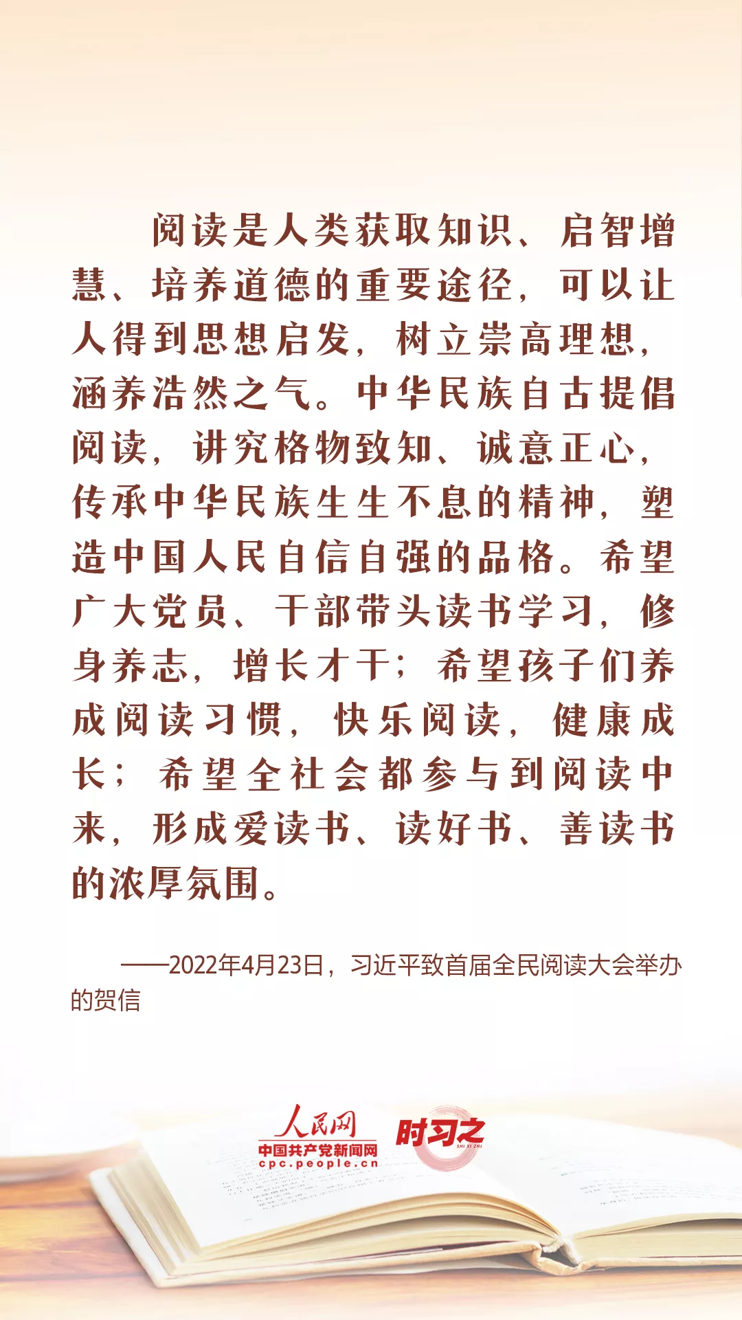 “阅读是人类获取知识、启智增慧、培养道德的重要途径,可以让人得到思想启发,树立崇高理想,涵养浩然之气。”