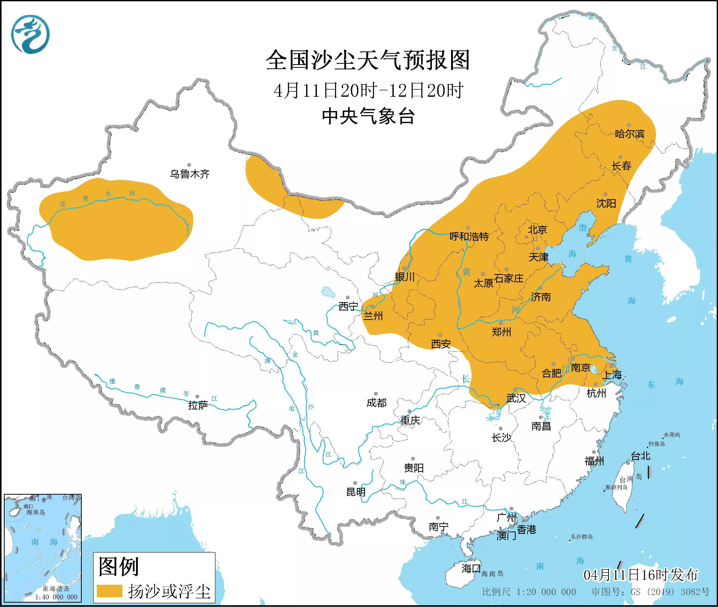 中央气象台11日6时继续发布沙尘暴蓝色预警:受冷空气大风影响,预计11日8时至12日8时,新疆南部、内蒙古大部、甘肃东部、宁夏、陕西中北部、山西、河北、北京、天津、山东、河南、安徽中北部、江苏、上海、湖北北部、黑龙江西南部、吉林中西部、辽宁中西部等地有扬沙或浮尘天气,其中,内蒙古中东部等地的部分地区有沙尘暴,内蒙古中部局地有强沙尘暴。