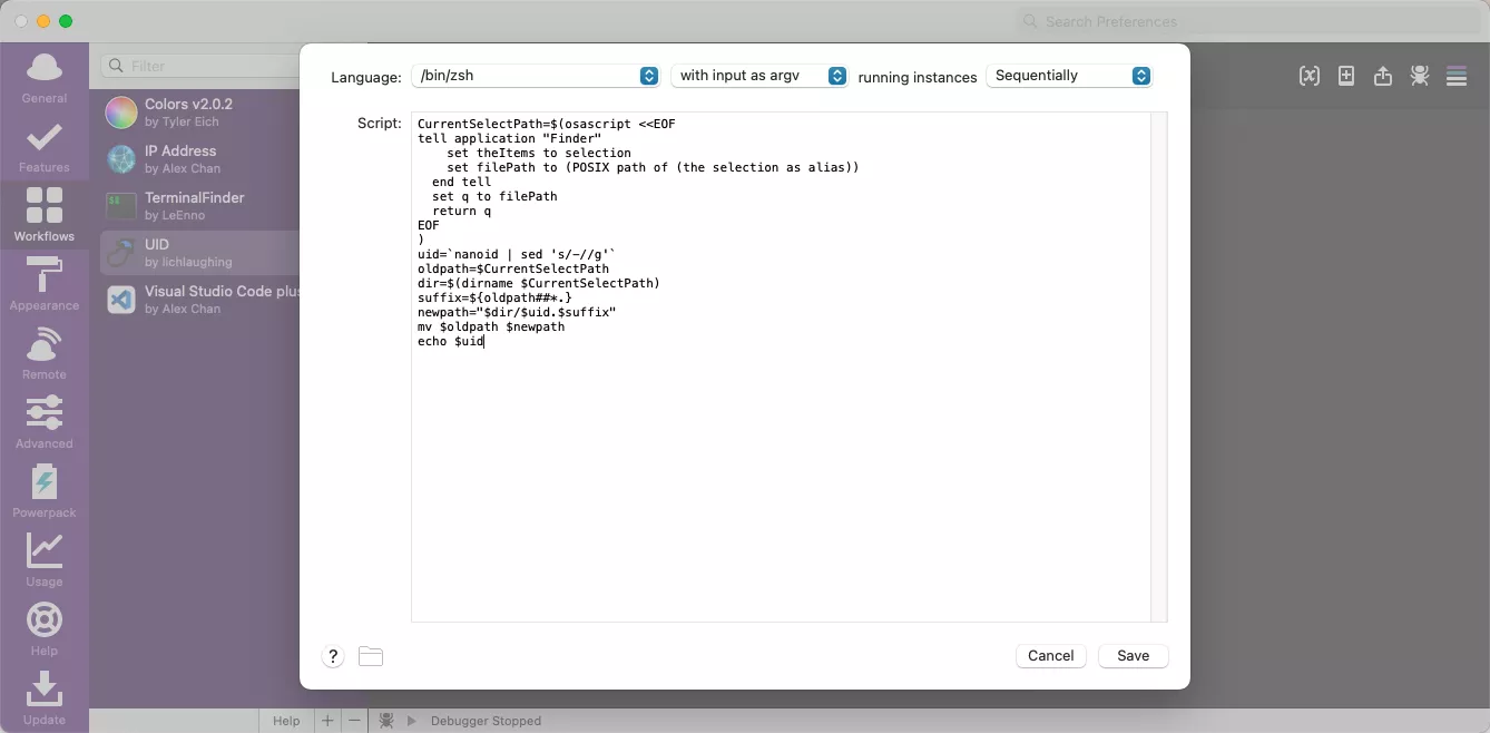 脚本内容意思是:获取选中的文件,截取文件的名称,然后获取个唯一ID,给文件重命名。