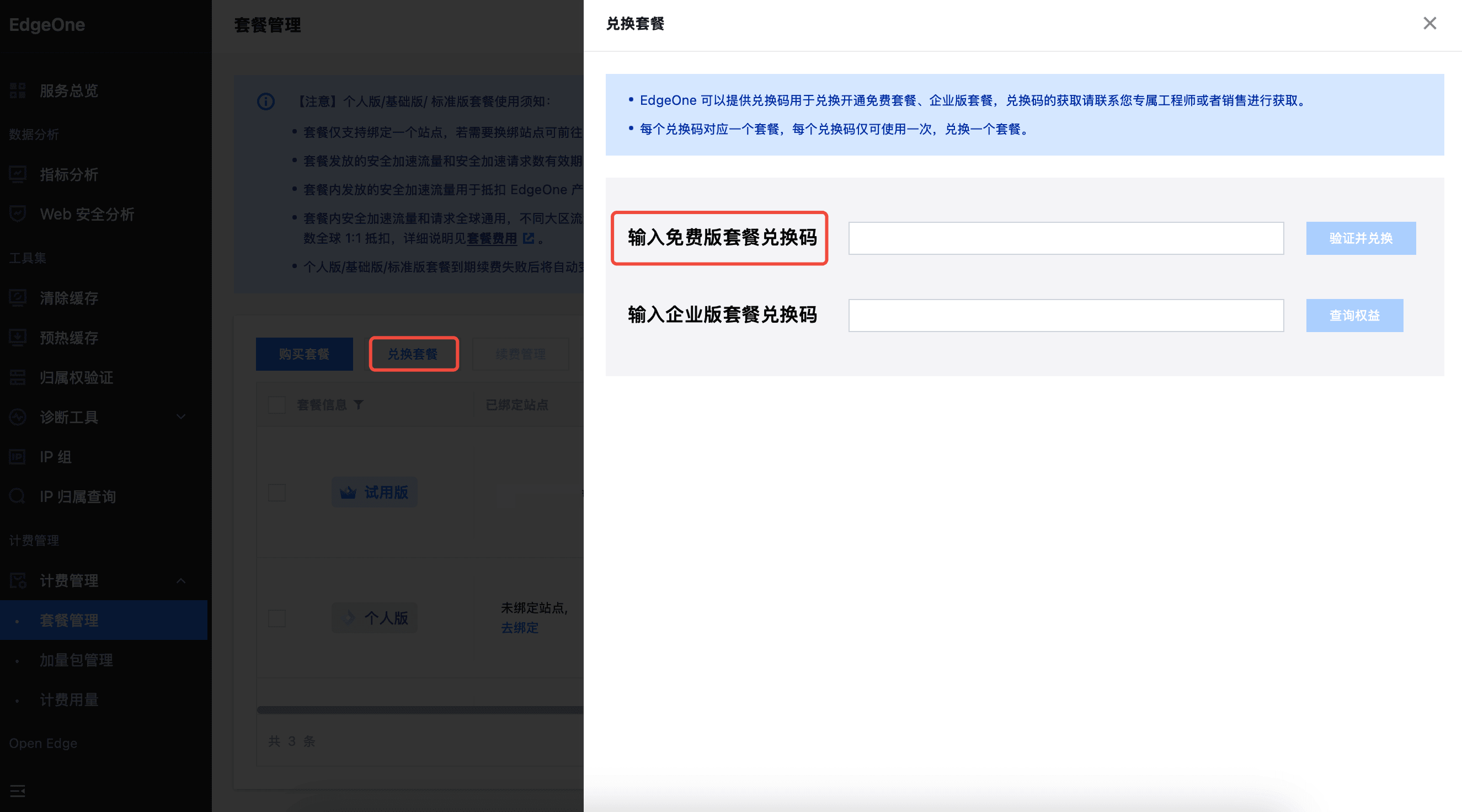 我们建议您前往 腾讯云中国站 进行兑换,注册并登录中国站账号后,您可以在 EdgeOne 控制台的“计费管理”>“套餐管理”中点击“兑换套餐”进行兑换。