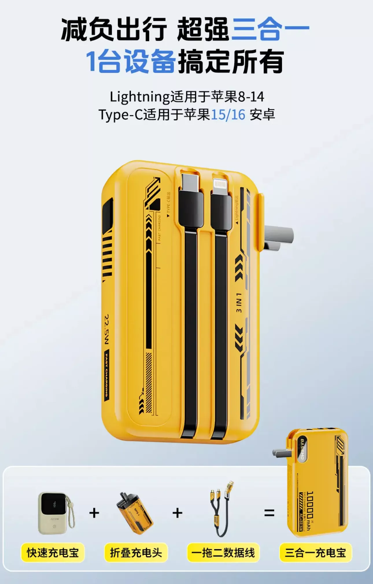 买了一个 65w 氮化镓三口(1 个 USB-A+2 个 Typec)充电头和一个 1w 毫安三合一充电宝。