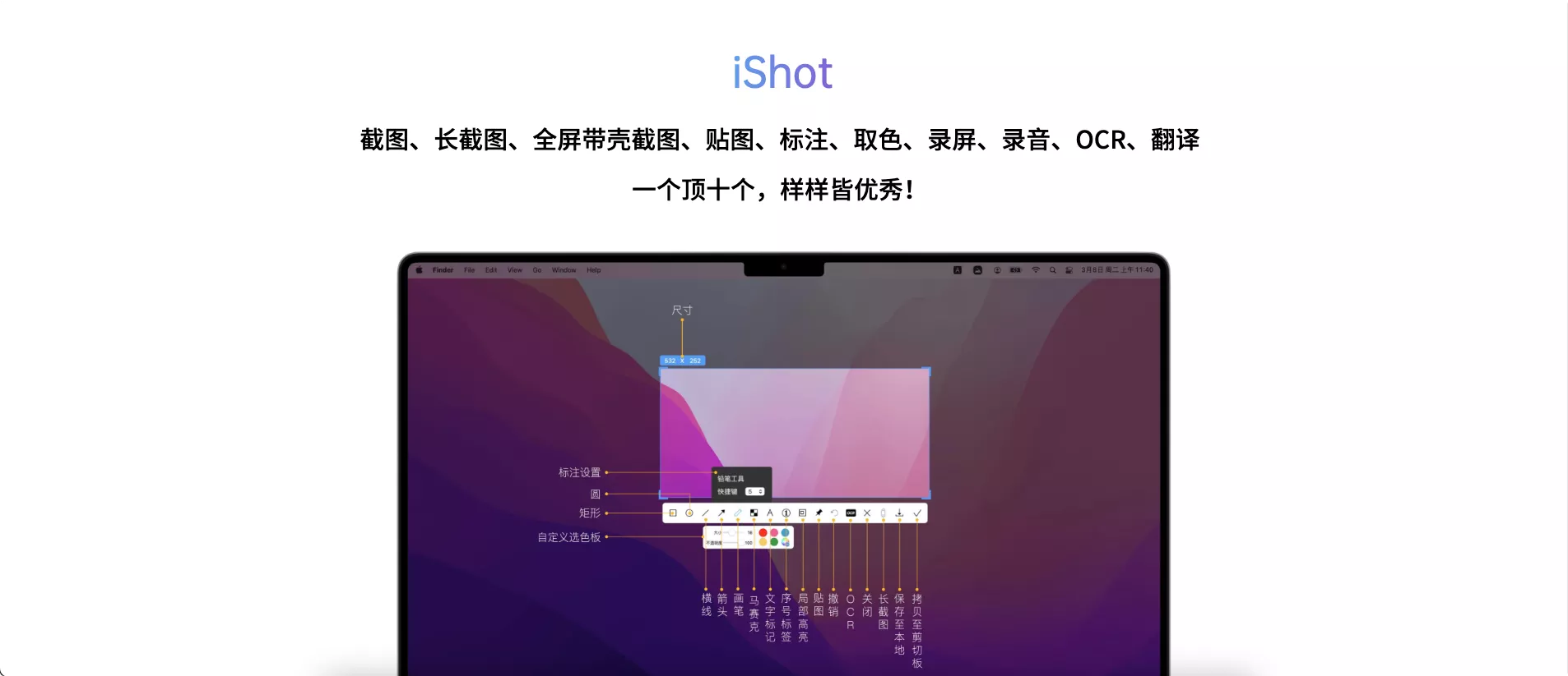 如官网所说:“截图、长截图、全屏带壳截图、贴图、标注、取色、录屏、录音、OCR、翻译