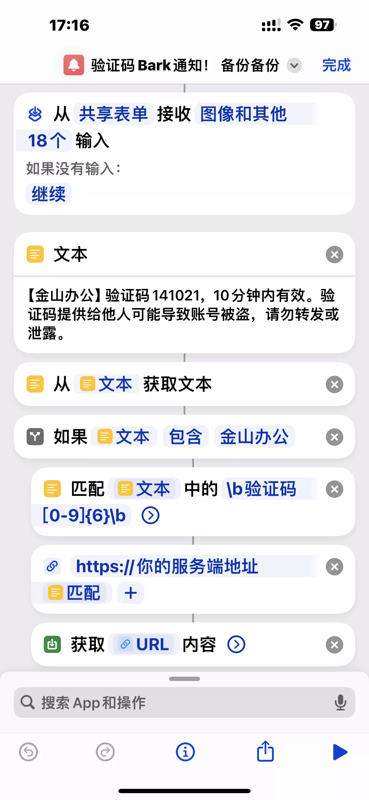 新建快捷指令,用于解析短信内容,然后把短信中的验证码提取出来,然后调用上面的地址发送推送通知即可。