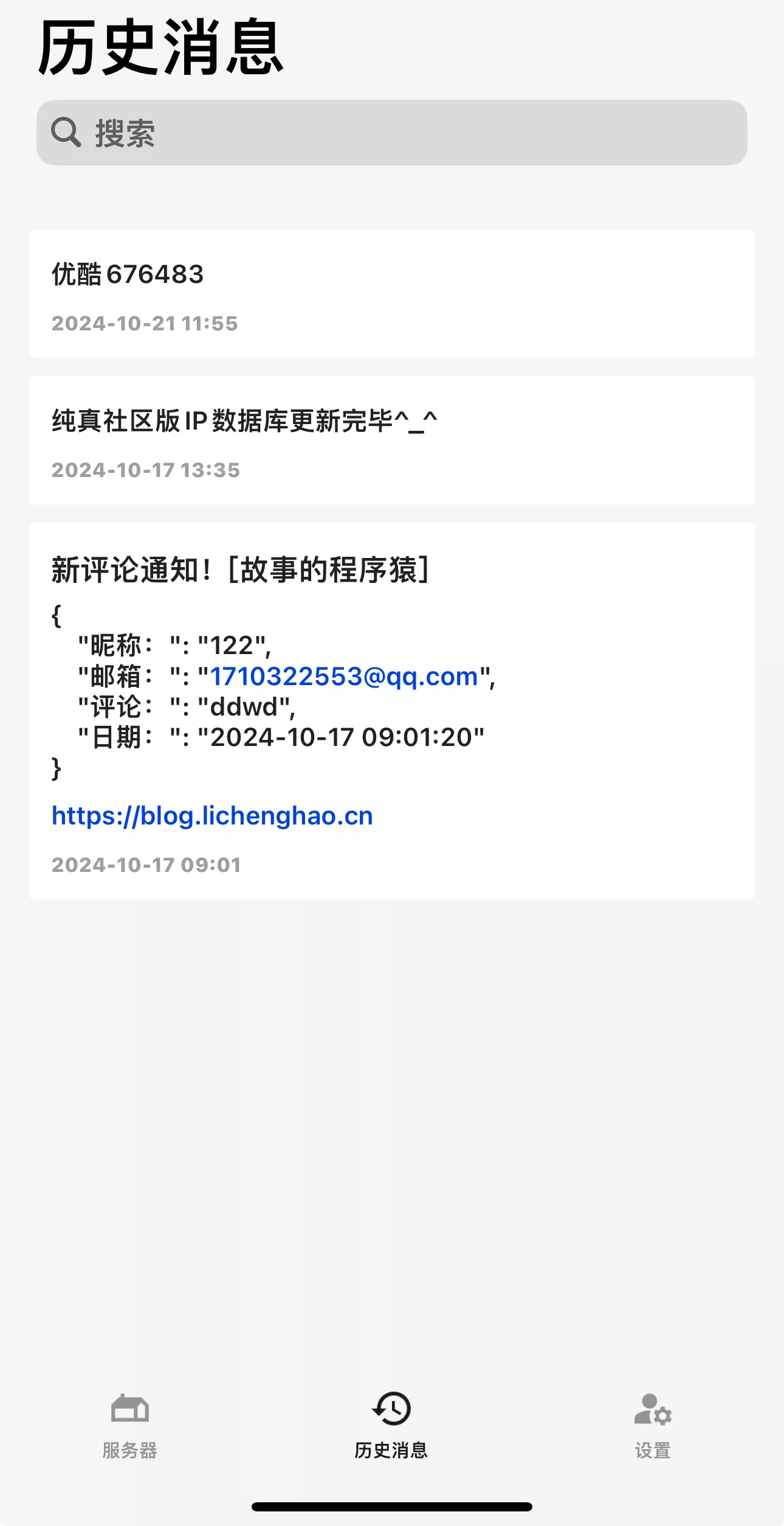 有了这个推送后,那么就可以干很多自定义通知了,比如:站点评论通知、网站备份通知、服务更新通知,总之是各种通知都可以!