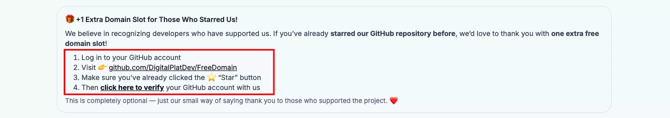 ⭐️他们的开源项目,然后回来点击 click here to verify,就可以再获取到一个域名额度。