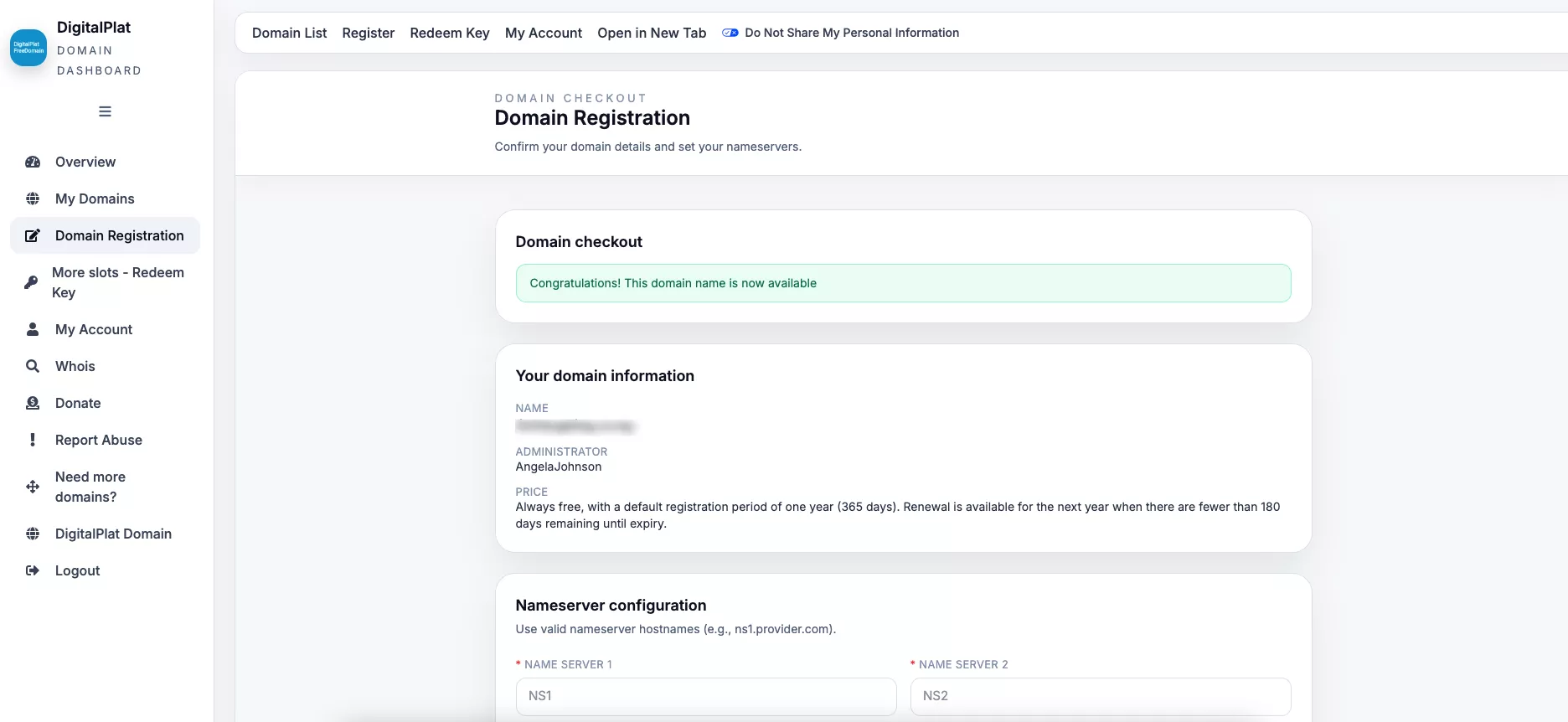 将这里的DNS服务名称复制到注册页面中要填写的Nameserver中。