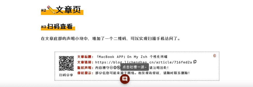 在文章底部的声明小块中,增加了一个二维码,可以实现扫描手机访问了。